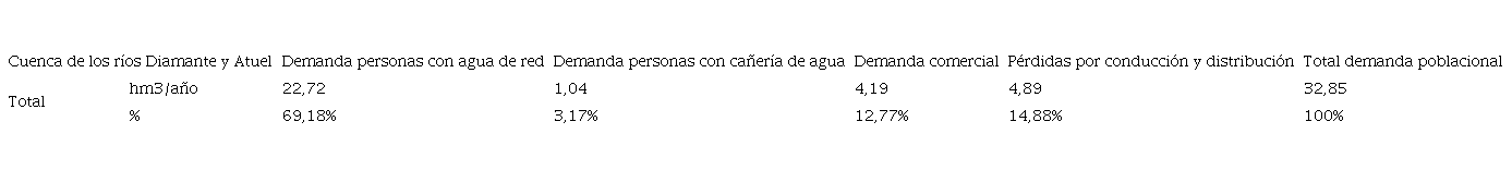 La demanda actual de agua por parte de los sectores residencial y comercial en la cuenca de los ríos Diamante y Atuel, calculada para el 2010, fue de 39,90 hm3/año, de los cuales 23,76 hm3 representaban la demanda residencial (59,56%), 4,19 hm3 la demanda comercial (10,51%) y 11,94 hm3 correspondieron a las pérdidas por conducción y distribución (29,93%).