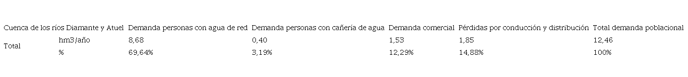 Al igual que en las dos cuencas anteriores, la demanda de agua por parte del sector poblacional en la cuenca de los ríos Diamante y Atuel se calculó siguiendo la metodología explicada en el apartado 2. De acuerdo a la Tabla 1, en la cuenca de los ríos Diamante y Atuel, en el 2010 existían 65901 hogares que disponían de agua de red y otros 3021 que, si bien no tenían agua de red, al menos disponían de cañería de agua dentro de las viviendas. Esto se traduce en 228623 y 10480 personas respectivamente.