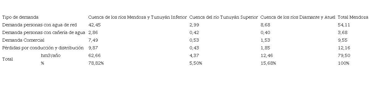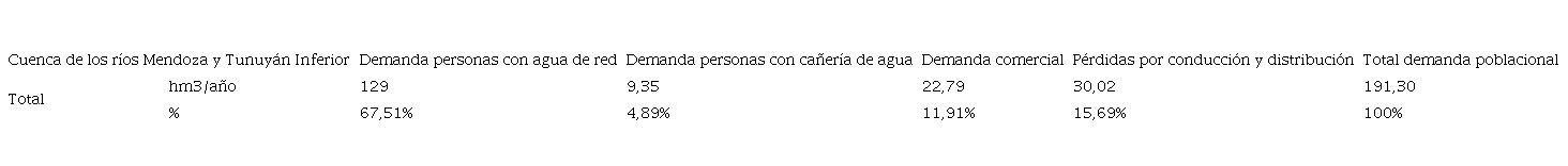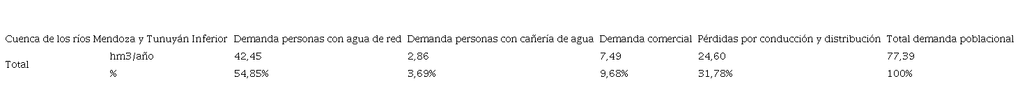 La demanda de agua actual por parte del sector poblacional en la cuenca de los ríos Mendoza y Tunuyán Inferior fue de 236,11 hm3/año, de los cuales 138,35 hm3 correspondieron a la demanda residencial (58,66%), 22,79 hm3 a la demanda comercial (9,65%) y 74,83 hm3 representaban las pérdidas por conducción y distribución (31,69%).
