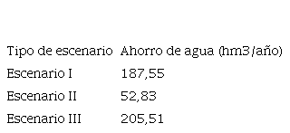 Bajo los supuestos establecidos para los escenarios I, II y III, se concluye que las estimaciones de ahorro de agua serían respectivamente de 187,55, 52,83 y 205,51 hm3/año. Resulta notable la incidencia en el ahorro de agua al comparar el primer escenario y con el segundo, éste fue significativamente mayor cuando se optimizó el consumo de agua per cápita que cuando se mejoró la eficiencia en la conducción y la distribución.