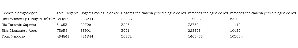 Tabla 1: Población con agua por red o por cañería en la vivienda en Mendoza, 2010. Por cuenca. En cantidad de hogares y de personas.