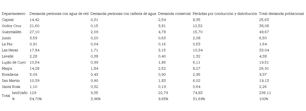 La demanda total de agua por parte del sector poblacional en Mendoza, para el año 2010 fue de 285,01 hm3/año, de los cuales el 59,12% (164,86 hm3/año) se refirió a la demanda residencial, el 9,81% (27,95 hm3/año) a la demanda comercial y 31,07% (88,54 hm3/año) correspondió a las pérdidas por conducción y distribución.
