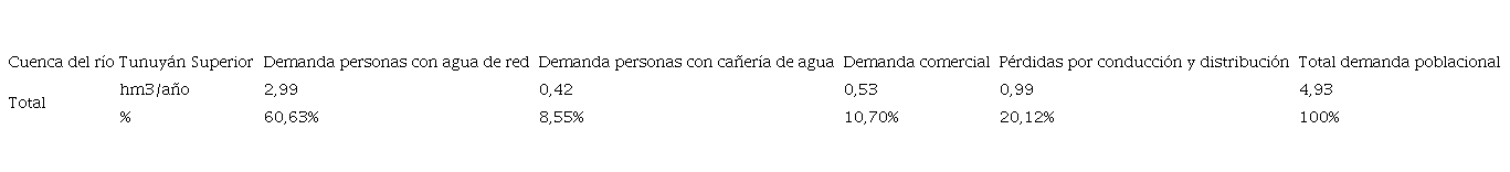 Tabla 7: Demanda de agua para el escenario I por parte del sector poblacional en la cuenca del río Tunuyán Superior según tipo de demanda. En hm3/año.