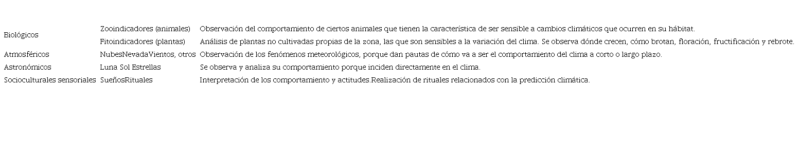 Claverías (2010) menciona que estos indicadores permiten decidir qué, cómo y dónde producir, mediante la observación e interpretación anticipada, del comportamiento de la naturaleza. Para Chilón (2018) y (2016) los indicadores y pronósticos agroclimáticos deben entenderse como una respuesta de los pueblos andinos, para determinar estrategias de cultivos y de siembras, en relación con sus necesidades de consumo alimenticio y defensa ante los riesgos climáticos. Marchant, Fuentes, Kaulen e Ibarra (2020) describe la capacidad de monitoreo de la predicción de eventos climáticos que se basan en la observación de las condiciones biológicas, atmosféricas y astronómicas, pero también en la espiritualidad y las sensaciones corporales.