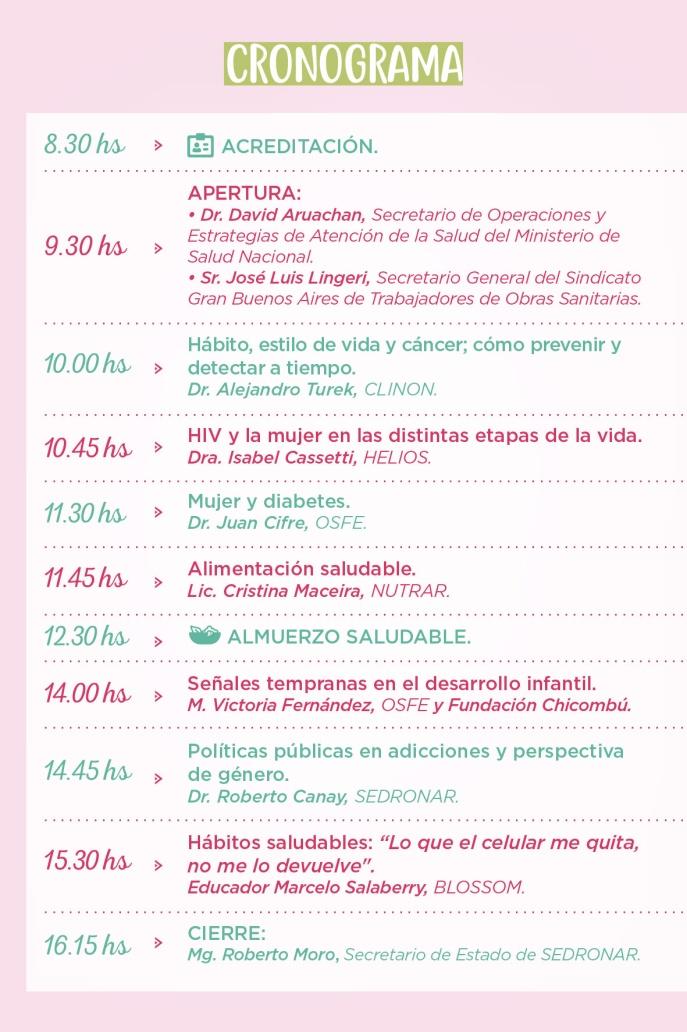 Las acciones llevadas a cabo por “Mujeres ferroviarias” incluyen temas relativos a la violencia, al problema de la mayor incorporación de trabajadoras en áreas tradicionalmente masculinas (es decir, ciertas “especialidades” ferroviarias donde la presencia de las mujeres es mucho menor, tales como los trabajos que se realizan en galpones y talleres, entre otros), participación en movilizaciones y organización de diferentes eventos. Pero también es importante tener en cuenta que estas acciones se suman a otras que, más tenuemente, ya venían dándose desde hace algunos años. En este sentido cabe mencionar a la “Jornada de la Mujer”, una actividad organizada conjuntamente entre UF y la Obra Social Ferroviaria, que se centra en temas asociados a la salud. Como puede verse en la Figura 4, el cronograma de actividades de dicha jornada muestra tópicos tales como la prevención y detección temprana del cáncer, “HIV y la mujer”, “mujer y diabetes” junto con otros sobre salud e infancia. Es decir, se trata de asuntos relativos a ellas en tanto (bio) mujeres y madres.