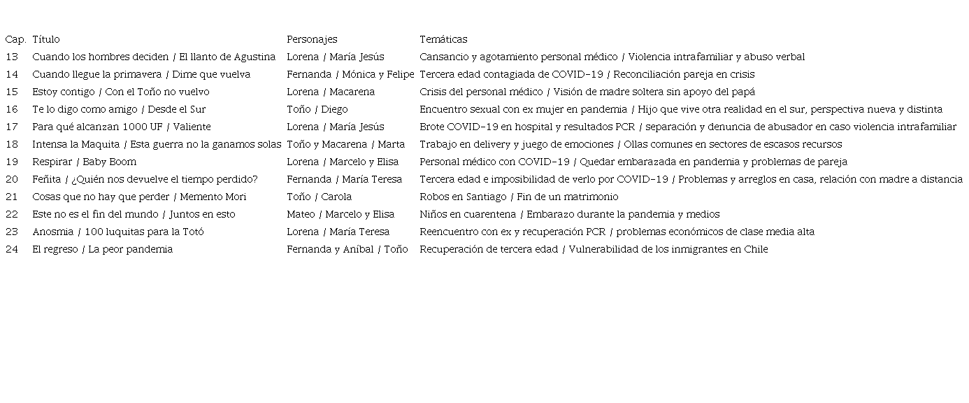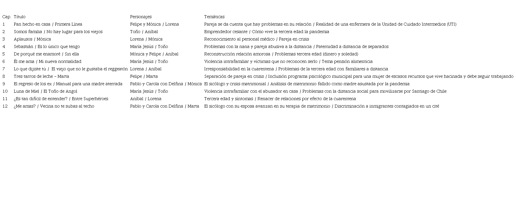 Lo anterior se refleja al desglosar el corpus de estudio. Al analizar los primeros doce capítulos, están las temáticas a nivel global y particularmente de Chile desde marzo: problemas de parejas (discusiones, crisis, separaciones, terapia), la realidad del personal médico, violencia intrafamiliar, temas de la tercera edad, la situación con empleadas domésticas y la discriminación de inmigrantes (ver Tabla 1).