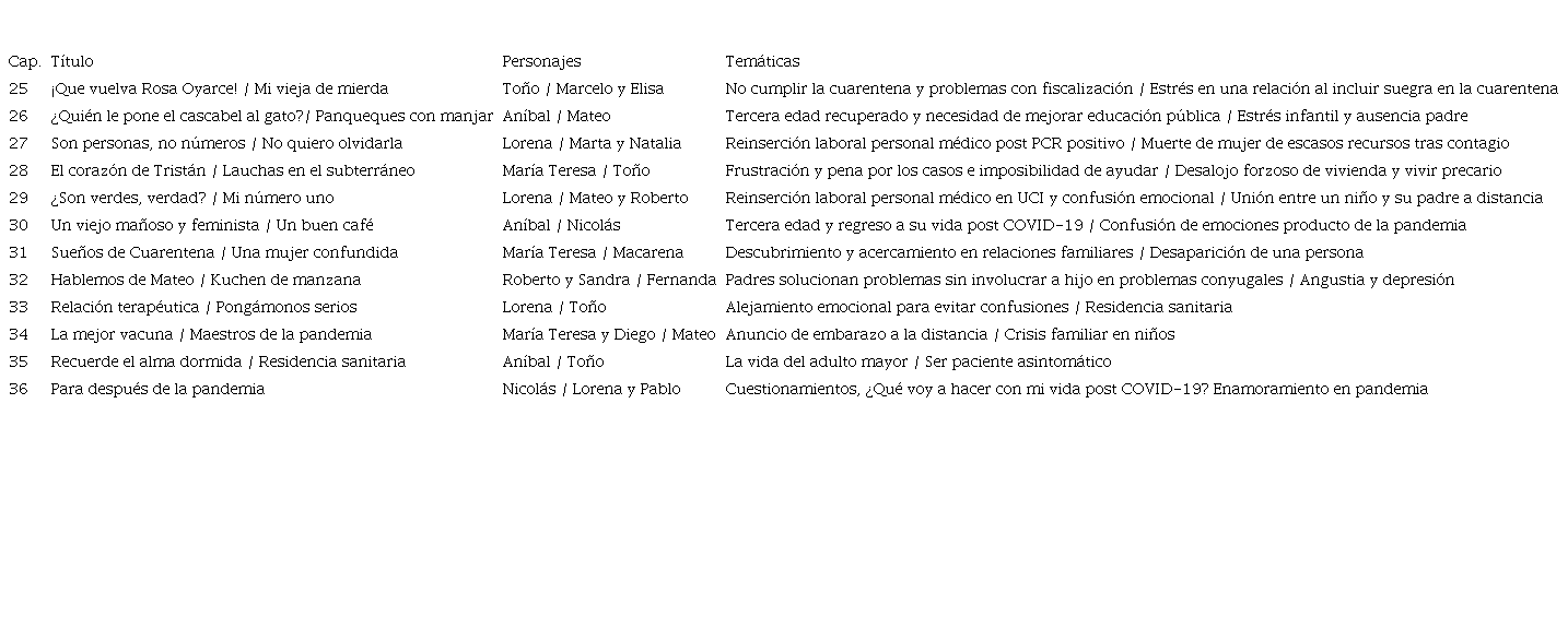 Así, nos enteramos de la muerte de uno de los personajes por no tener acceso a un tratamiento más efectivo (“por ser pobre”, el efecto de la cuarentena en niños de padres separados, temáticas como vivir en una residencia sanitaria y ser paciente asintomático, problemas con la fiscalización de las personas que no cumplen la cuarentena, y finalmente, el estrés infantil producto de clases on-line, el desalojo forzoso de vivienda y vivir precariamente, el embarazo en pandemia, la frustración del personal médico, cuestionamiento más potente en el último capítulo: “¿Qué voy a hacer con mi vida post COVID-19?” (Ver Tabla 3).