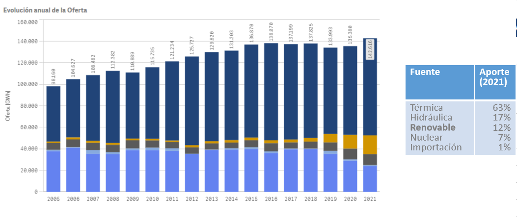 El aumento de la participación de las ER en la matriz energética nacional se ha visto impulsado por estas políticas directas hacia la incorporación de sistemas de generación a partir de fuentes renovables como la solar, sobre todo a partir del año 2018. Desde entonces a la actualidad el 12 % de la demanda total del mercado eléctrico mayorista se abasteció con generación renovable (Gráfico 1).