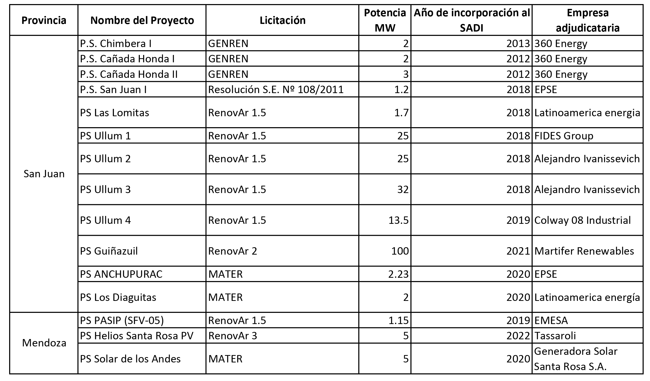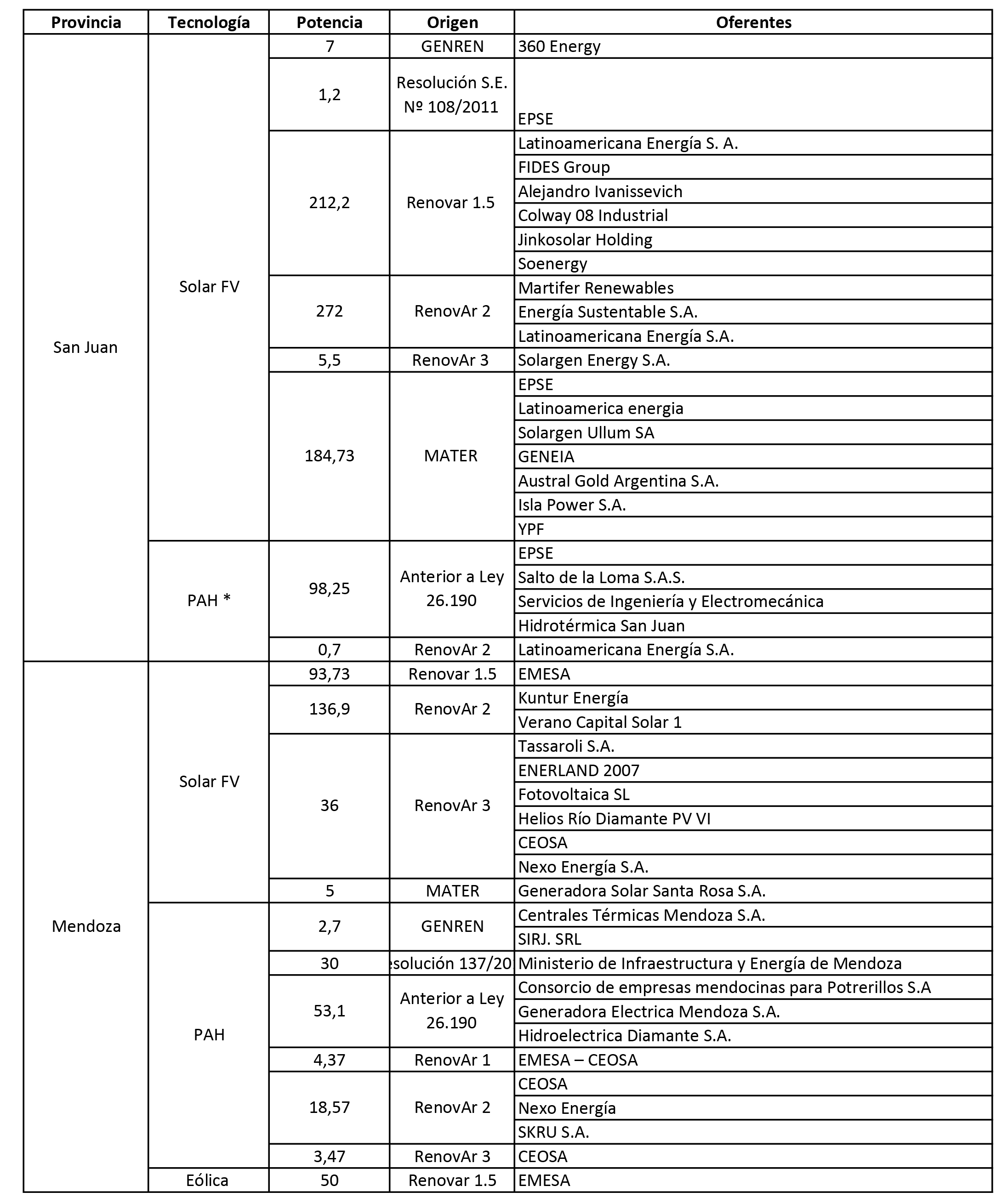 Al iniciar el análisis de la configuración de actores del complejo energético en estas provincias, podemos identificar distintos recorridos en términos de participación, composición de actores y modos de concretar los proyectos que explican esa generación. La Tabla 1 enumera los proyectos licitados en San Juan y Mendoza. Asimismo, presenta una caracterización de cada uno al distinguir la incorporación de sistemas de generación de energía por fuentes renovables según la tecnología aplicada y la potencia oportunamente adjudicada con la intermediación de la Secretaría de Energía y CAMMESA. Por último, presenta una primera mención de los actores oferentes que participaron en vinculación con las políticas energéticas que les dieron origen.
