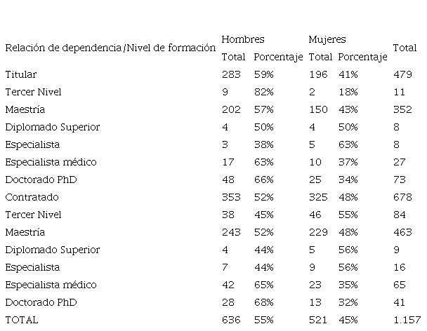Salazar et al, 2020Los datos del personal académico titular y los grados de formación académica muestran que existe un mayor número de docentes que poseen maestrías, de los cuales el 57% son hombres y el 43% son mujeres. El doctorado, es el segundo nivel de formación de docentes bajo esta modalidad de contratación, aunque en un número menor. En este caso, el 66% de los docentes titulares con doctorado son hombres mientras que el 34% son mujeres. Los datos de docentes contratados y su grado de formación académica muestran que existe un número superior con título de maestría seguido por tercer nivel, especialista médico y finalmente doctorado. En estos cuatro niveles académicos los hombres son mayoría. Por ejemplo, en el caso de maestrías, los hombres representan el 52% frente al 48% que representan las mujeres. En el caso del doctorado, la brecha es aún superior. El 68% son hombres mientras que las mujeres solo representan el 32% (Tabla No.1).