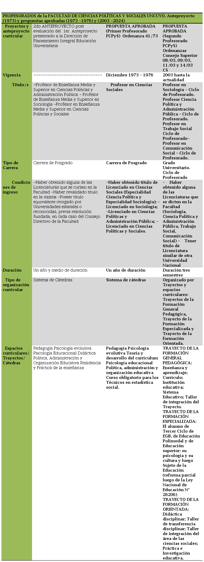 Por su parte, la nueva currícula establecida en la Ordenanza 41/73-R, incluyó dos carreras de tecnicatura (carreras intermedias), dos de grado (Licenciatura en Ciencias Sociales, con las especialidades de Ciencia Política y Sociología, Licenciatura en Administración Pública) y una de posgrado (correspondiendo al Profesorado en Ciencias Sociales), esta última formación como culminación de un proceso de formación. El Informe da cuenta del ordenamiento en ciclos curriculares que “garantizarían el proceso de especialización creciente” y, en relación al Profesorado, dice algo que se desea destacar: “responde a una real necesidad” (Informe de Evaluación Tarantuviez, 1973).