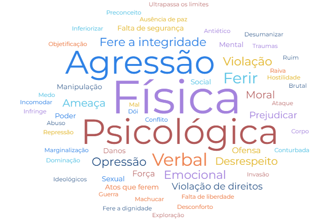 Também foram encontradas palavras associadas à violência simbólica, com “psicológica”, “verbal”, “manipulação” que apontam para uma situação de fragilidade e insegurança na dimensão cultural (Galtung, 2003). Estas formas de violência estão relacionadas com o contexto simbólico, familiar e social que, por vezes afetam a autoestima, a motivação, saúde e o bem-estar, sendo um aspecto crucial a ser abordado no ambiente universitário, além da conscientização sobre as violências e suas consequências.