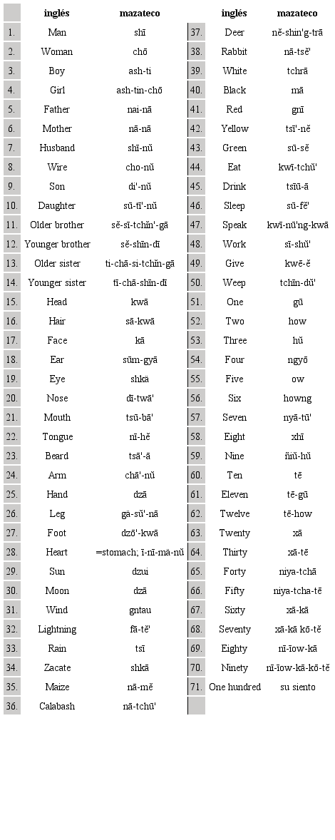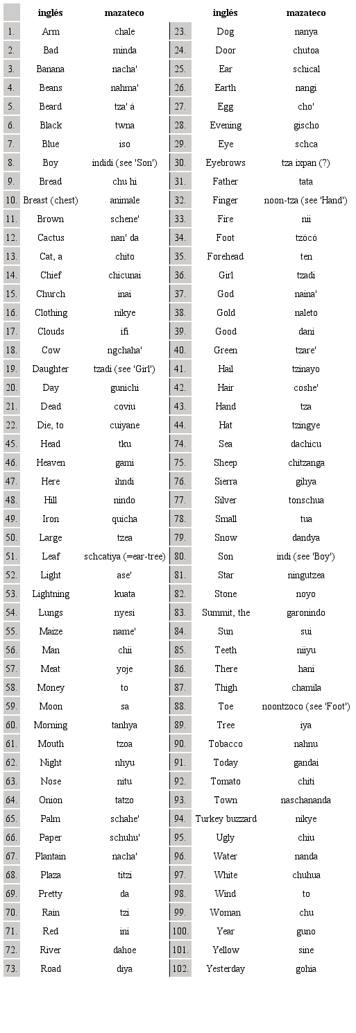 En la primera tabla se presenta el vocabulario de mazateco proporcionado por Pinart a Brinton (1892). La segunda contiene el vocabulario inglés-mazateco de la obra de Starr (1900) y, finalmente, en la tercera se muestran las palabras en mazateco de la obra de Belmar (1905b).