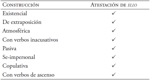 ELLO se da en las construcciones impersonales existenciales (12), de extraposición (13) y atmosféricas (14) en todas las variedades ibero-románicas aquí investigadas: