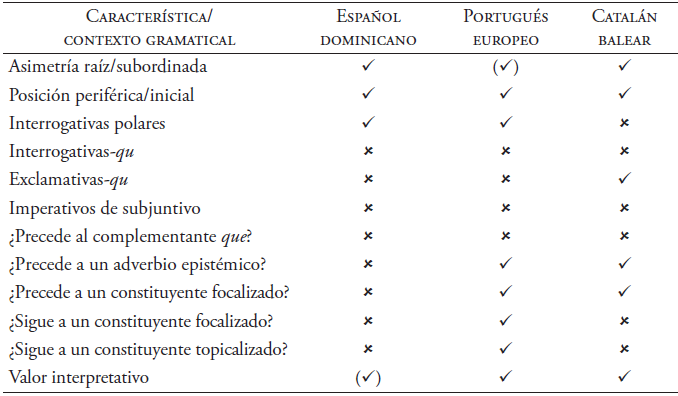 El expletivo ibérico se manifiesta, pues, en contextos relacionados con la aserción, concretamente en las cláusulas principales (según lo ilustrado arriba) y los complementantes subordinados de verba dicendi (cf. Hooper & Thompson 1973; Aelbrecht et al. 2012):9