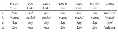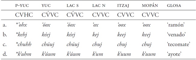 Tal como lo muestra el Cuadro 1, hay una correspondencia general entre los idiomas yucatecanos con respeto a la longitud de la vocal. Así, las palabras del proto-yucatecano con la forma CVHC, donde H representa una fricativa velar o glotal, resultaron tener la forma CV́VC en yucateco y entre hablantes mayores de lacandón del sur de Lacanjá. En este último sitio, los hablantes más jóvenes perdieron la distinción entre tono alto y tono bajo y solo tienen vocales largas (Hofling 2014: 28).
