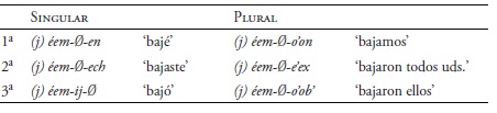 El conjunto B con la conjugación de éem-el ‘bajarse’ en yucateco muestra diversos ejemplos que aparecen en el Cuadro 10 (Bricker et al. 1998: 401).