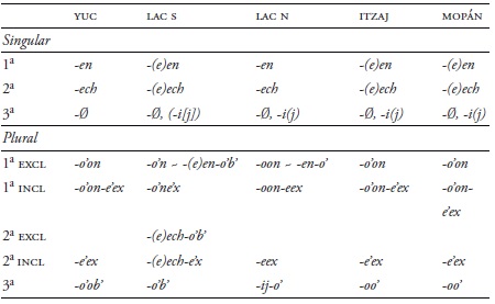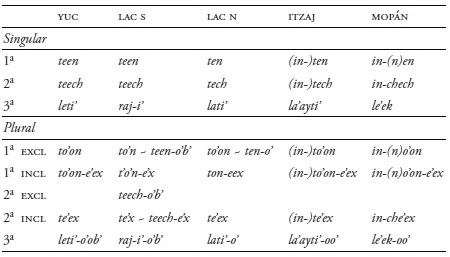 Por el lado de los marcadores del conjunto B, estos siempre marcan objetos directos de verbos transitivos, sujetos de verbos intransitivos en los estatus de completivo dependiente y sujetos estativos con adjetivos y sustantivos (Hofling 2006a; 2006b), tal como se presentan en el Cuadro 9.4 Únicamente en lacandón se refleja una innovación en la primera y segunda persona del plural con -(e)en-o'(b'), ‘nosotros (exclusivo)’ en la primera persona y en lacandón del sur -(e)ech-o'b' y -(e)ech-e'x con la segunda persona del plural exclusivo e inclusivo, respectivamente.