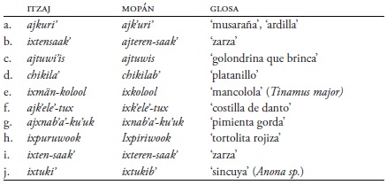 Por otra parte, cabe destacar que hay varios términos de flora y fauna que solo aparecen in itzaj y mopán, como se describe en el Cuadro 14. Entonces tenemos términos de flora y fauna que contrastan entre el yucateco con las lenguas yucatecas del sur, donde el vocabulario indica un contacto más intenso entre el itzaj y mopán (Hofling 2008).