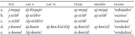 Los clasificadores (a)j= ‘masculino’ y (i)x= ‘femenino’ también aparecen con sustantivos agentivos como se nota en el Cuadro 15, donde indican el género del agente. Por ejemplo, en itzaj ajtz'iib es ‘escritor’ y ixtz'iib' es ‘escritora’, mientras que en lacandón del sur estas formas llevan el sufijo posesivo -ir (o -in), y generalmente, entran en construcciones de poseído-poseedor como en äjtz'íib'ir ju'n, ‘escritor de papel’ (cf. Hofling 2014).