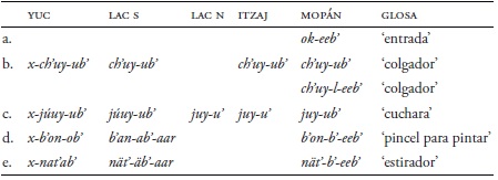 Los sustantivos instrumentales también muestran diferencias en la rama yucatecana, como se ve en el Cuadro 16. En yucateco y lacandón del sur se marcan con un sufijo -Vb'. Pero los sustantivos instrumentales en yucateco también tienen el clasificador femenino x=. El lacandón del norte y el itzaj casi no tienen ejemplos. En itzaj es más común usar formas del sustantivo agentivo para expresar instrumentos. El mopán tiene formas con -Vb', como ch'uyub' 'colgador' pero es más común usar formas con -eeb': -eeb' solo con raíces intransitivas, por ejemplo ok-eeb' ‘entrada’, -l-eeb' con raíces posicionales como en ch'uy-l-eeb' ‘colgador’, y -b'-eeb' con raíces transitivas, como en b'on-b'-eeb' ‘pintura’. Este fenómeno también ocurre en yucateco colonial (Bolles & Bolles 2001: 31) y permite reconstruirlo para el proto-yucatecano.