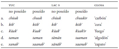 En yucateco y en lacandón del sur, pero no en itzaj ni mopán, existe una clase de sustantivos que cambia de tono cuando es poseído, como se ve en el Cuadro 17. Cuando están poseídos tienen una vocal larga con tono bajo (cf. Bricker et al. 1998: xvii). Por ejemplo, kib' ‘cera’ (no poseída) y in-kiib' ‘mi cera’. En lacandón del sur tämän ‘algodon’ es un miembro de esta clase pero no en yucateco.