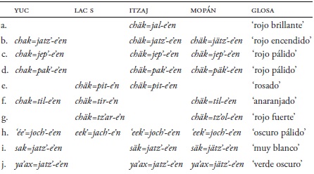 Hay una clase interesante de compuestos adjetivales que se refieren a colores que aparecen en todos los idiomas yucatecanos, como se ilustra en el Cuadro 18. Se forman de una palabra que connota el color. Por ejemplo, a chäk ‘rojo’, se agrega una raíz, generalmente de un verbo transitivo, como jätz' ‘cuerear’ y el sufijo -e'en, resultando en chäk-jätz'e'en ' que es ‘rojo encendido’, término cuya forma aparece tanto en itzaj y mopán y la forma correspondiente a chak-jatz'e'en en yucateco. El valor del color que refiere varía un poco en todo el grupo. Las glosas son de itzaj y mopán. Estas formas aparecen en yucateco colonial (Smailus 1989: 135-37; Bricker 1999) y son reconstruibles en proto-yucatecano.