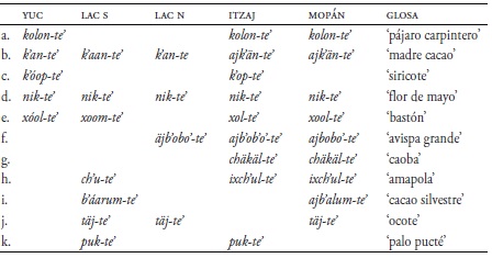 Como mencioné líneas arriba, hubo varios contactos de los yucatecanos con los idiomas cholanos, algunos antes de la diversificación de las lenguas mayas alrededor de 950 d.C. y posterior a este periodo. El léxico también refleja esos contactos. Un ejemplo es el préstamo de términos de flora y fauna con la forma cholana -te' ‘árbol’, cognado con la forma yucateca che' ‘arbol’. Ejemplos con -te' también aparecen en los códices (Vail 2000: 46-48). Representaciones de (a)-(e) se muestran en el Cuadro 18 tanto en yucateco y en las otras lenguas, sugiriendo que son préstamos antiguos. Por ejemplo k'an-te' ‘madre cacao’ aparece en yucateco y en formas cognadas en todas las otras lenguas yucatecas. Pero las lenguas del sur tienen más préstamos con -te' lo que sugiere que sean préstamos después del inicio de la diversificación del proto-yucateco. Por ejemplo täj-te' ‘ocote’ aparece en lacandón del sur, lacandón del norte y mopán, pero no en yucateco. Los ejemplos en el lacandón pueden ser el resultado de contacto con itzaj y mopán (cf. Hofling en prensa).