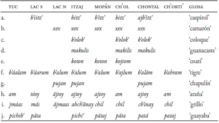 Existen otros términos de flora y fauna que indican un contraste entre el yucateco y los otros idiomas yucatecanos del sur, como se observa en lel Cuadro 13. Estas formas sugieren un área de contacto entre las lenguas yucatecanas del sur. Por ejemplo, la palabra ‘araña’ es to(o)y en todas las lenguas sureñas, pero es am en yucateco, un reflejo del proto-yucatecano que también tiene am (Kaufman & Justeson 2003; cf. Hofling 2008en prensa).