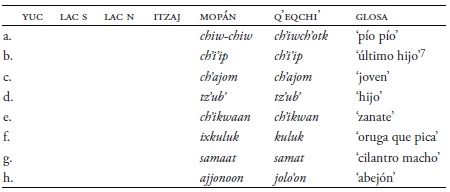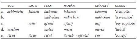 Hay más ejemplos de contacto con ch’orti’ como muestra el Cuadro 21, los cuales indican contactos entre dicha lengua con el mopán (Hofling 2017b). Nuevamente, entre el yucateco y el itzaj existe la consonante ch en la palabra (i)xcheme(e)s ‘ciempiés’, mientras en lacandón del sur es kamees y en mopán ixkames con k, lo cual muestra el contacto entre estas lenguas y el ch’orti’. El lacandón del sur, el itzaj, el mopán, y el ch’orti’ comparten la palabra de rey zopilote, usij en mopán y ch’orti’, usiir en lacandón del sur y usil en itzaj. Es probable que los préstamos en lacandón del sur sean el resultado del contacto con el mopán y el itzaj.