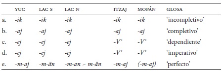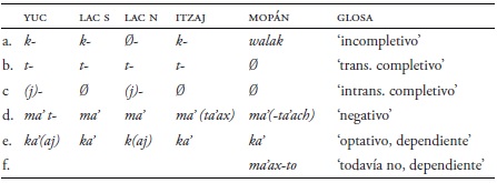 Los verbos en todos los idiomas yucatecanos tienen prefijos que son marcadores de aspecto, pero en mopán su forma es distinta. Como se ve en el Cuadro 23, este idioma tiene un sistema diferente con walak en el incompletivo y sin un marcador del aspecto completivo (Hofling 2006a; 2006b; 2017a). Cabe mencionar que walak también aparece en el yucateco colonial (Smailus 1989: 90). En este rubro, el mopán es más conservador que las otras lenguas (Kaufman 1991).