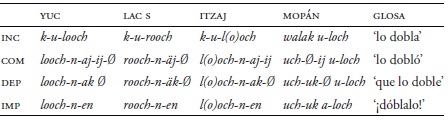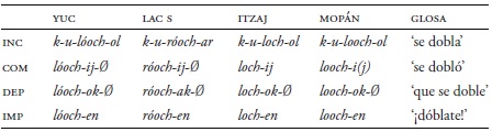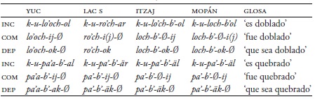 La voz antipasiva también refleja diferencias que se ven en el Cuadro 26 (Hofling 2017a). La forma en mopán es completamente distinta. Se usa una construcción perifrástica con el verbo intransitivo uchul ‘suceder’ (Danziger 1996; Hofling 2011b). Por ejemplo, en itzaj dicen lochnajij ‘dobló’, pero en mopán se dice uchij uloch. Hay unos pocos ejemplos arcaicos en mopán con el antipasivo con -n-, pero la forma perifrástica es una innovación del mopán.