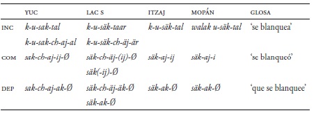 Los verbos incoativos o versivos, que derivan verbos intransitivos de adjetivos y sustantivos, indican variación como se puede ver en el Cuadro 29 (Hofling 2017a). El yucateco tiene dos marcadores en el estatus incompletivo: -tal y -ch-aj como en k-u-sak-tal o k-u-sak-ch-aj-al ‘se vuelve blanco’. La forma es sak-ch-aj-ij ‘se volvió blanco’ y la forma del dependiente corresponde a sak-ch-aj-ak ‘que se blanquee’. El itzaj y el mopán usan -tal en el incompletivo y -aj en el completivo, igual que itzaj säk-aj-ij ‘se blanqueó’ y en el dependiente säk-ak ‘que se blanquee’.