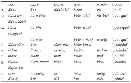 Las partículas de interrogación también indican patrones interesantes entre las lenguas yucatecanas, como muestra el Cuadro 30 (cf. Hofling 2017a). En mopán se realiza la forma distintiva de k'u' ‘qué’. Las formas que terminan en x en el yucateco vienen del clítico ix (Bolles & Bolles 2001: 76). Por ejemplo, en yucateco colonial se encuentran las formas b'al-(i)x que se transformó en ba'ax ‘qué’; mak-(i)x que cambió a ma'ax ‘quién’; y b'ik-(i)x cambió a b'ix ‘cómo’. Diversas formas antiguas existen en lacandón como b'a'r ‘qué’, m(á)ak ‘quién’, tub'aj ‘dónde’ y b'ik ‘cómo’. En mopán también se presentan las formas antiguas mak ‘quién’, tub'aj ‘dónde’ y b'iki ‘cómo’.