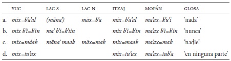 Las formas negativas también muestran diferencias, como se ve en el Cuadro 31 (cf. Hofling 2017a). La forma antigua ma'-ix ha cambiado a mix en yucateco e itzaj, mäx en lacandón del norte, y ma'ax en mopán. Así, el yucateco y el itzaj son similares con respeto a las formas negativas.
