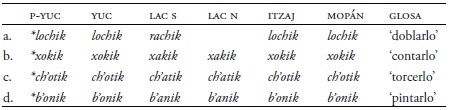 Continuando con el tema de las vocales, en el Cuadro 4 apreciamos que en el proto-yucatecano la *o corta permanece como /o/ en yucateco, itzaj, y mopán, pero cambió a /a/ en lacandón del sur y lacandón del norte. Por ejemplo, en proto-yucatecano la base transitiva en el estatus incompletivo *ch'otik ‘torcerlo’ corresponde a ch'otik en yucateco, itzaj y mopán pero a ch'atik en lacandón del sur y en lacandón del norte.
