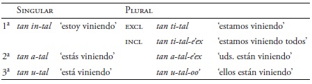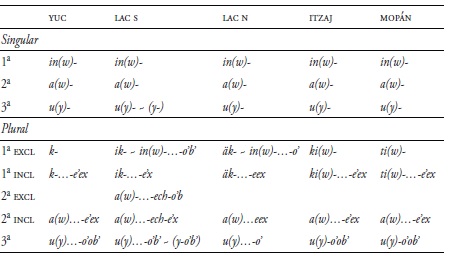 En todas las lenguas yucatecanas, los marcadores de persona (pronombres dependientes) aparecen con sustantivos, verbos y adjetivos en dos conjuntos: el A (prefijos) y B (sufijos). El conjunto A se refiere al caso del ergativo y el conjunto B al absolutivo. Los marcadores de A se muestran en la tabla 6 (cf. Hofling 2006b).3