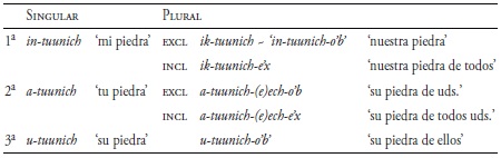 Un ejemplo más del conjunto A se observa en la conjugación del verbo intransitivo en mopán, tal como se muestra en el Cuadro 7 (Hofling 2011: 43), así mismo se muestra con un sustantivo poseído en el lacandón del sur en el Cuadro 8 (Hofling 2014: 37).