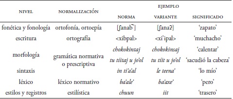 La normalización ni puede ni quiere detener el cambio lingüístico. Ciertas normas bien fundadas cesan de ser válidas un día. Por ejemplo, Beltrán de Santa Rosa (1859 [1746], §§85s) se opone vigorosamente al uso del verbo ts’o’k ‘terminar’ como auxiliar de aspecto perfectivo defendiendo la norma del auxiliar t- en esta función. El tiempo ha pasado su lucha por alto, y hoy ts’o’k es un auxiliar aspectual bien establecido en el sistema. Si la norma no se ajusta a las convenciones que han cambiado, se vuelve obsoleta e irrelevante.