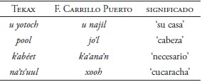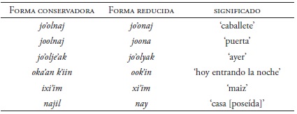 En el mismo espíritu conservador, las Normas de escritura restituyen en la escritura muchas ocurrencias del fonema /k’/ que no se oyen nunca, por ejemplo, en óo’lal ‘razón’, que ellas escriben <óok’lal> (p. 199). Véase también el §3.5.3.2 sobre escritura etimológica.