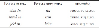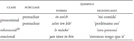 En maya, todos los clíticos son ENCLÍTICOS.19 Existen las clases presentadas en el Cuadro 12: