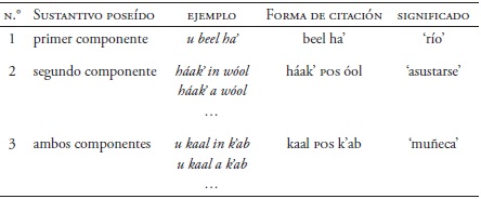 El segundo caso problemático lo constituyen los lexemas complejos que contienen un sustantivo obligatoriamente poseído que requiere un clítico posesivo. Este se representa aquí, en general, por la abreviatura POS. Este símbolo se substituye por cualquiera de las formas del paradigma de clíticos pronominales prenucleares. Los lexemas en cuestión se encuentran en las construcciones presentadas en el Cuadro 14.