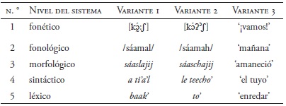 Las variantes se encuentran en dos niveles: dos variantes de una unidad lingüística pueden pertenecer a variedades distintas de la lengua o a una sola variedad de ella. En el primero de los casos, su distribución obedece a factores sociolingüísticos que determinan todas las variedades en cuestión; en el segundo, obedece a reglas específicas del sistema lingüístico que subyace la variedad en cuestión. Por ejemplo, la alternativa de si para significar ‘por poco’ digo áaynak u óolak depende de si hablo el dialecto de Yucatán o el de Quintana Roo; pero si uso el sufijo -kin o el sufijo -kun para formar un verbo factitivo (como utskinah ‘mejorar’ o k’ask’unah ‘peorar’) depende de factores fonológicos reglados por el sistema. El §2.1. introduce los tipos de variación del primer nivel, el §2.2. los del segundo nivel.