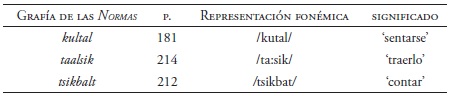 En estos casos también, las Normas de escritura se someten a un automatismo que postula la transferencia directa de la fonética a la escritura, y concluyen sin cuestionarlo que la escritura debe reproducir las variantes fonéticas. Dicho en otras palabras, abandonan el principio de grafía morfofonémica. Sin embargo, no lo hacen de manera consistente. Mientras no conservan la /b/ glotalizada en xi’ipal, sí la conservan en ts’íibta’al (en el título del libro).