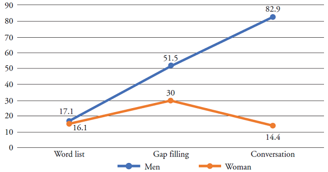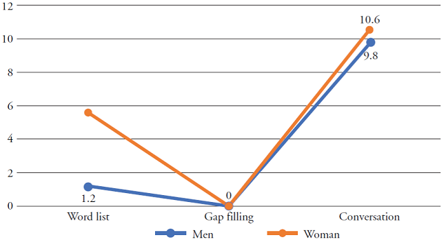 In general, it is apparent from Figure 3 and Table 3 that the omission of phonemes /d/ in less formal styles are part of phonological processes that tend to vary. In comparing the incidence of elision of the phoneme /d/ by men and women with primary and high school studies, the results show that men and women with primary school studies tended to elide more the phoneme /d/ than men and women with high school studies. In contrast to the previous patterns of elision discussed above, the following figure shows distinct patterns of elision between men and women with university education: