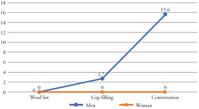 In contrast to men and women with primary school studies, Figure 3 shows that women with high school studies elided more the phoneme /d/ than men. However, as shown in Table 3, we would like to point out that the instances of elided phonemes by both men and women were considerably low.