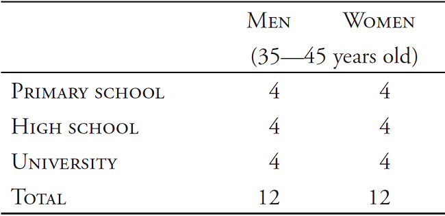 As can be seen from Table 1, 24 participants were part of the study; 12 males and 12 females, four from each educational level. This representative number is in line with Wardhaugh’s (2010) argument that it is possible to use a small sample from a large city or area and yet “get good results” (p. 159). The 24 participants were randomly selected in the street, asked some preliminary questions to see if they met the above criteria, and invited to participate in the study. Their consent was provided in a consent form. They were also informed of their right to be protected from identification, and withdraw their participation in the study at any time.