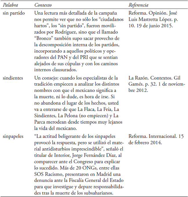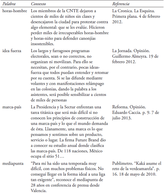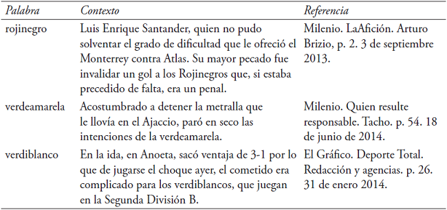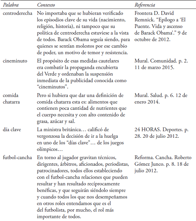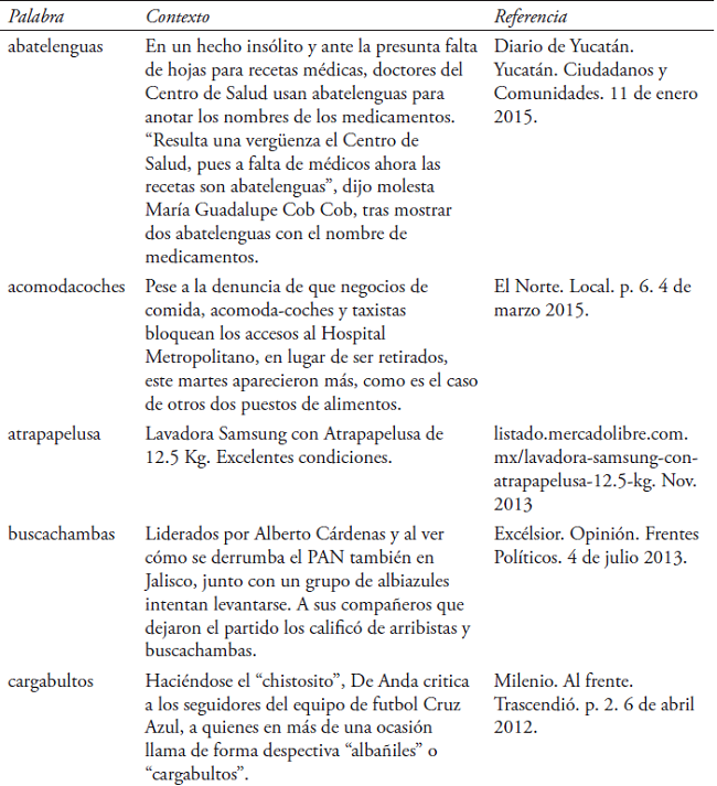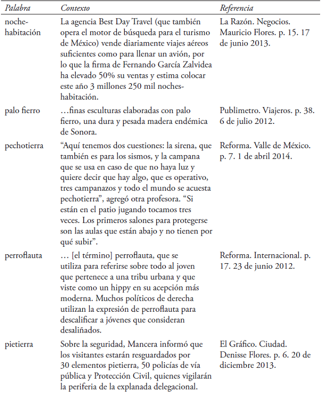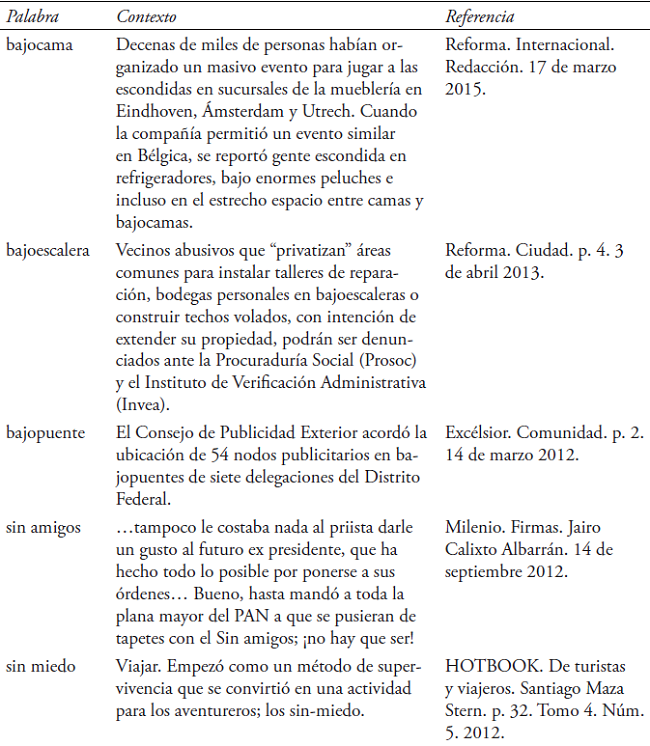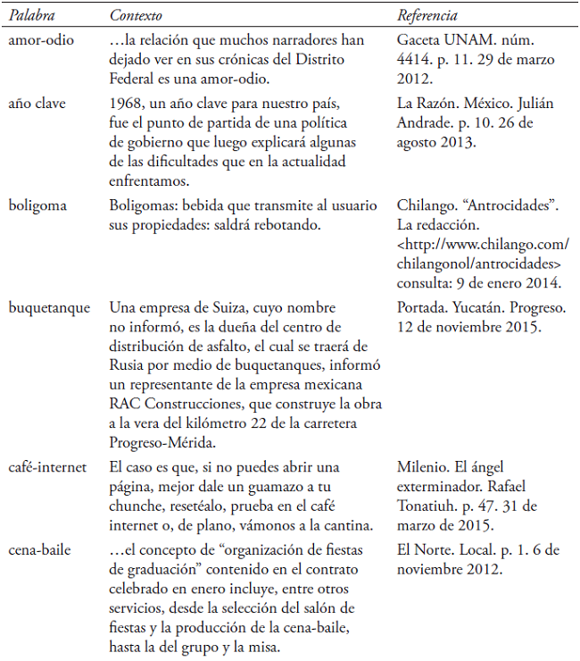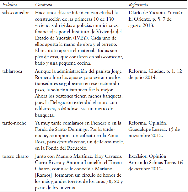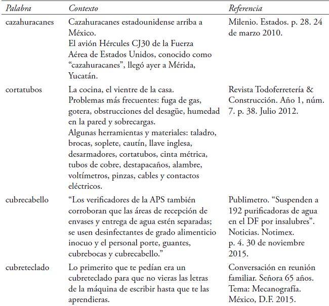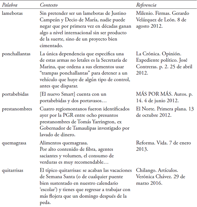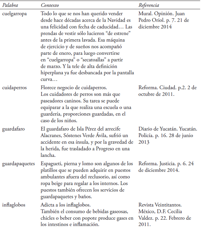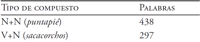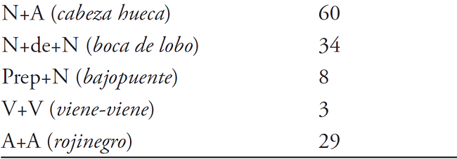 Los totales en el cuadro se refieren al total de palabras por esquema compositivo. Para esta investigación, del total de palabras compuestas se consideraron únicamente las que, de acuerdo con análisis previos, serían consideradas exocéntricas.