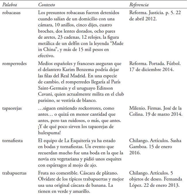 Como podemos observar en el cuadro anterior, la mayoría de los compuestos tienen una interpretación agentivo o instrumental. Ejemplos de neologismos con interpretación de agente son los siguientes: acomodacoches, buscachambas, cargabultos, guardafaro, lamebotas, prestanombres, robacasas, romperredes, vendepatrias, etc. Con interpretación de instrumento tenemos: abatelenguas, atrapapelusa, cazahuracanes, cortatubos, cubrecabello, inflaglobos, ponchallantas, quemagrasa, tapaorejas, trabapuertas, etc. Para el caso de locativos, el número es mucho menor: cuelgarropa, guardapaquetes, portabebidas, etc. Finalmente, para acciones: quitarrisas, tornafiesta, etc.