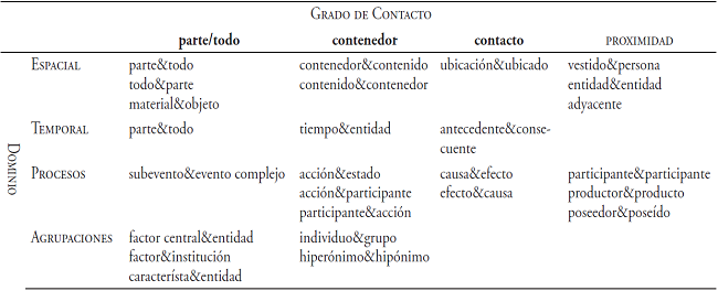 espacial: Se refiere a las relaciones de contigüidad que existen prototípicamente en predicaciones que incluyen relaciones de espacialidad en un ámbito físico y material.